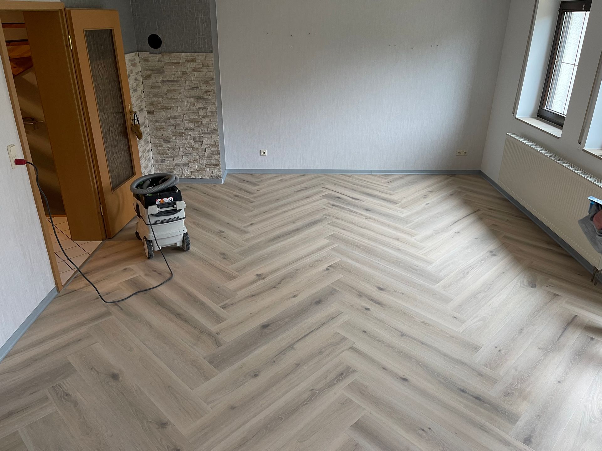 • Vorbereitung des Untergrunds – Spachteln, Schleifen, Ausgleichen für perfekte Ebenheit. Zusätzlich prüfen wir die Tragfähigkeit des Untergrunds, um eine langlebige Verlegung zu gewährleisten
